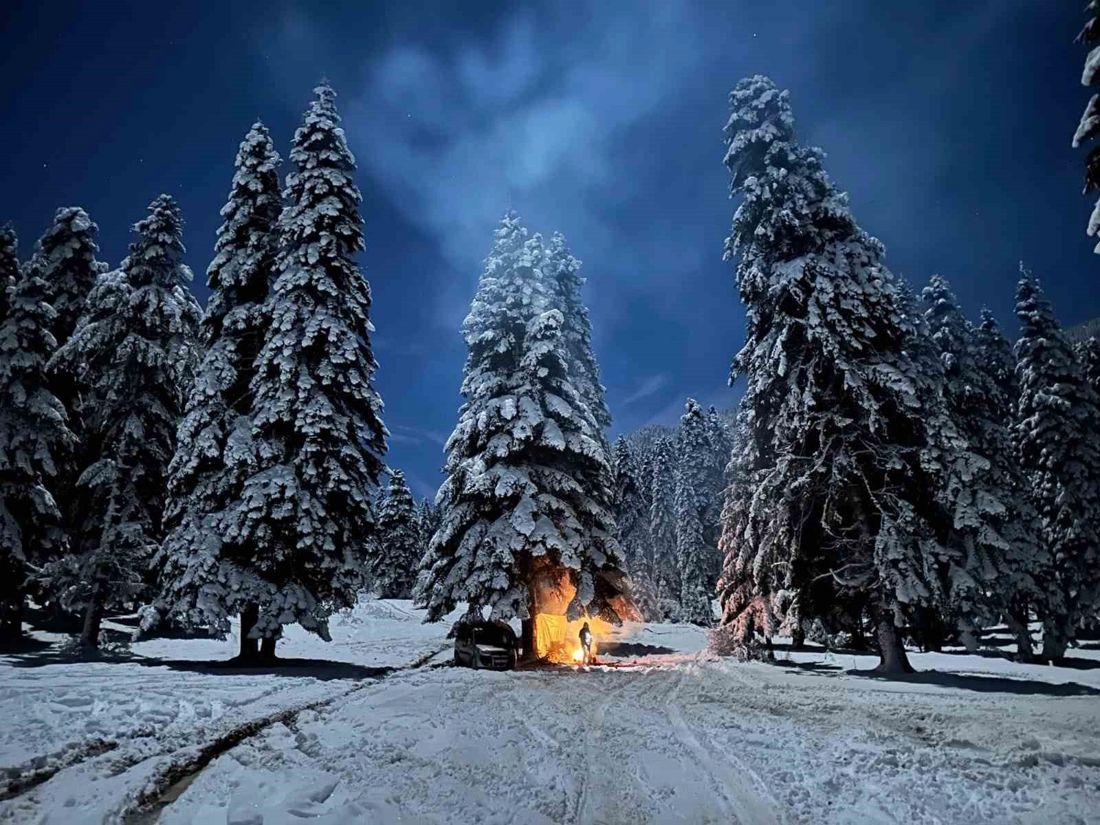 1500 rakımlı Sarıçiçek Yaylası'nda bulunan göletin kenarında kamp yapan iki arkadaş, gördükleri tilkiyi yanlarına çağırarak ekmek verdi. Karnını doyuran tilki daha sonra bölgeden uzaklaşırken, o anlar cep telefonu kamerasına yansıdı. Yaylada ay ışığının aydınlattığı kar örtüsü ise kartpostallık görüntüler oluşturdu.