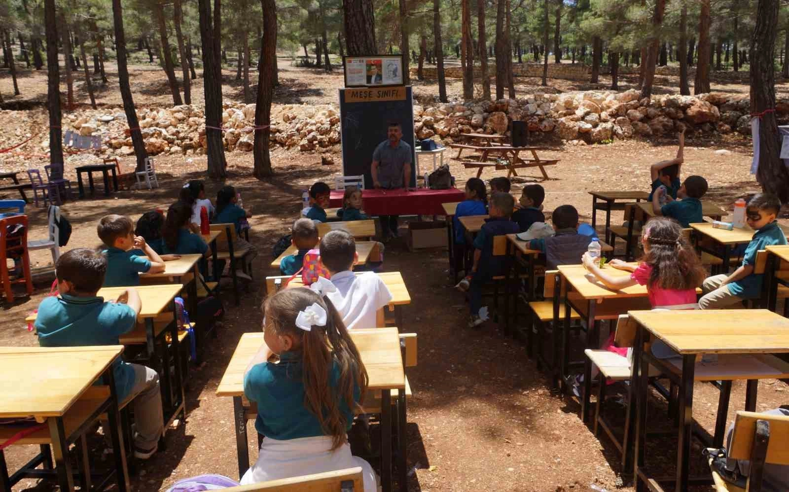 Karaman'ın Ermenek ilçesinde öğrenciler okulların kapanmasına 1 hafta kala resim, müzik ve beden eğitimi derslerini açık alanda yapıyor.