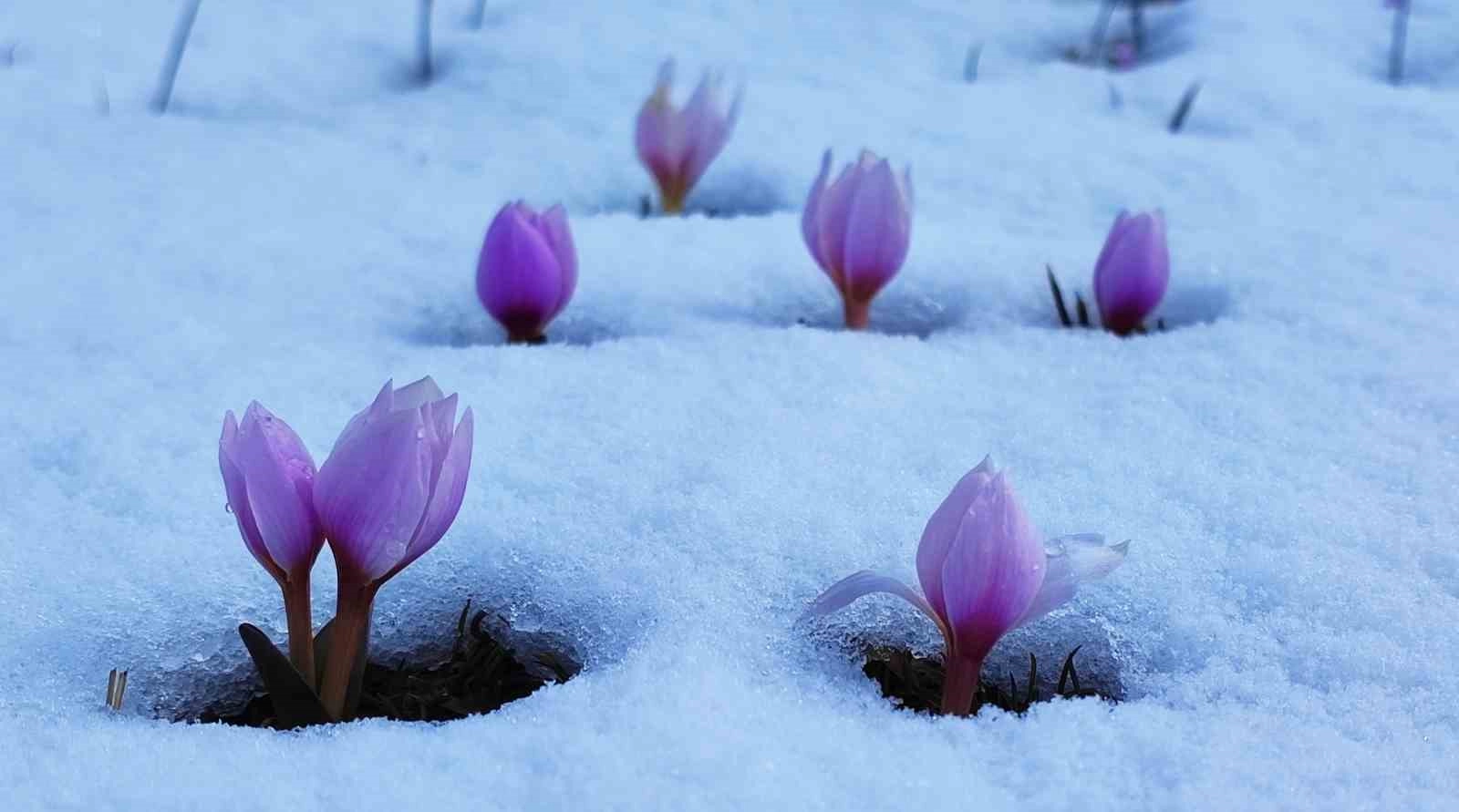 Bitlis'te karlar altındaki çiğdem çiçekleri kartpostallık görüntüler oluşturuyor.