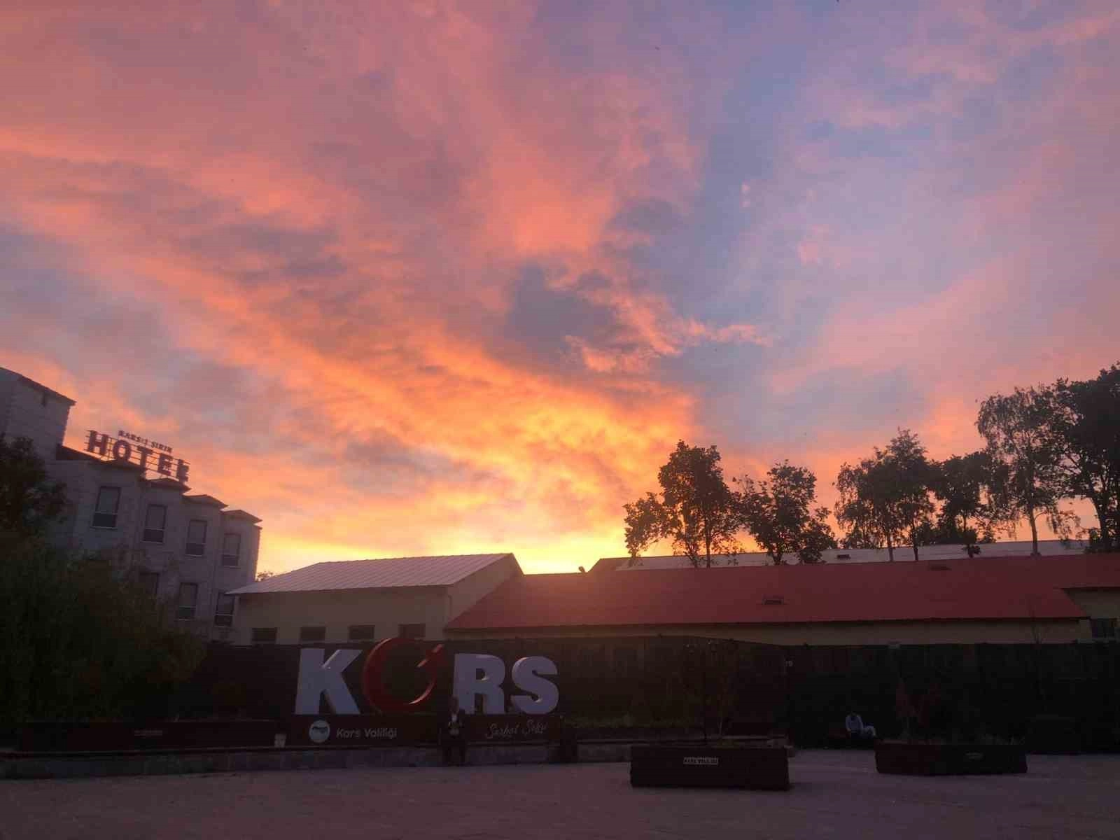 Kars'ta akşam saatlerinde gökyüzünün kızıla bürünmesi kartpostallık görüntüler ortaya çıkarırken, tarihi yapılar ve cami ile birlikte kameralara yansıdı. Vatandaşlar cep telefonlarına sarılarak anı ölümsüzleştirdi. Bulutların kızıla büründüğü görüntüler, yaklaşık 10 dakika sonra tamamen kayboldu.