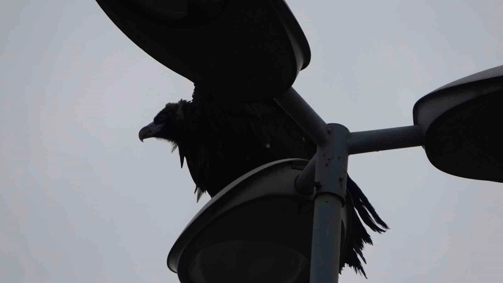 Sahilde bir müddet durduktan sonra aydınlatma direğine çıkan akbabaya kargalar saldırmaya çalıştı. Direk üzerinde bir süre bekleyen akbaba uçarak gözden kayboldu. Vatandaşlar ise o anları cep telefonu kamerası ile çekti.