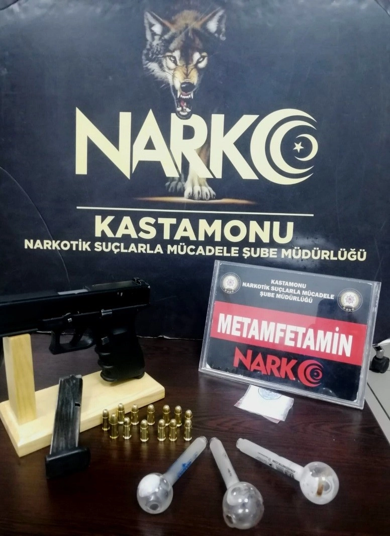 Edinilen bilgiye göre, Kastamonu İl Emniyet Müdürlüğü Narkotik Suçlarla Mücadele Şube Müdürlüğü ekiplerinin uyuşturucu madde kullanan ve satan şahısların yakalanmasına yönelik yapılan çalışmalar çerçevesinde, takibe alınan iki şahsın bulunduğu araç durduruldu. Araçta ve şahısların üzerinde yapılan aramada 1,08 gram metamfetamin, 3 adet cam düzenek, 1 adet ruhsatsız tabanca, 13 adet tabanca fişeği ele geçirildi.