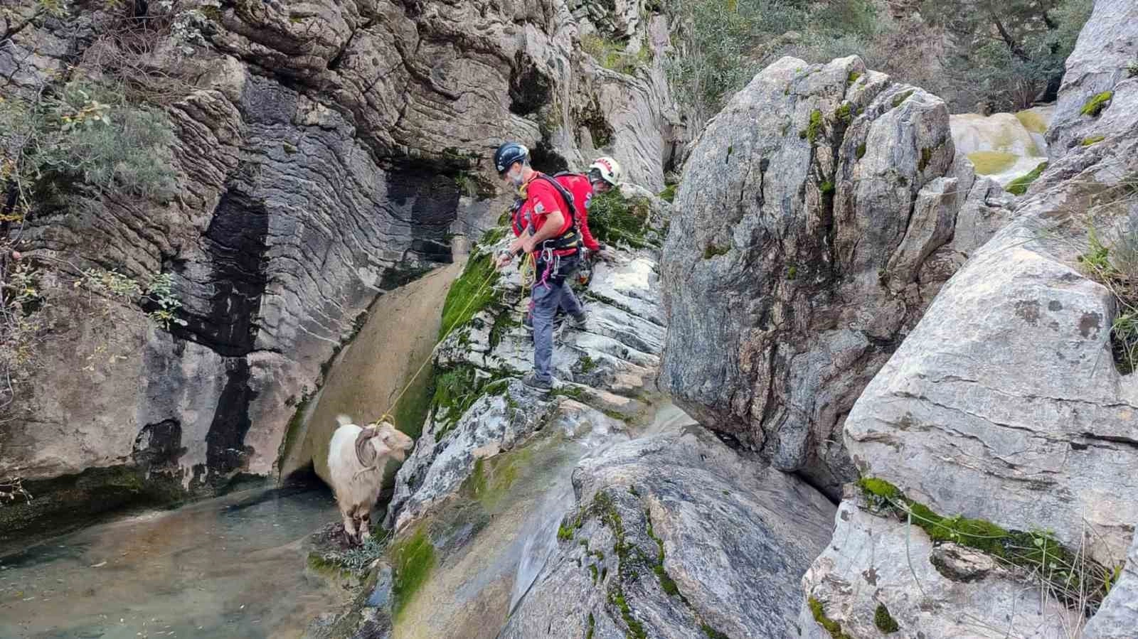 Muğla'nın Marmaris ilçesinde kayalıklarda mahsur kalan keçi Marmaris AKUT ekibi tarafından kurtarılarak sahibine teslim edildi.