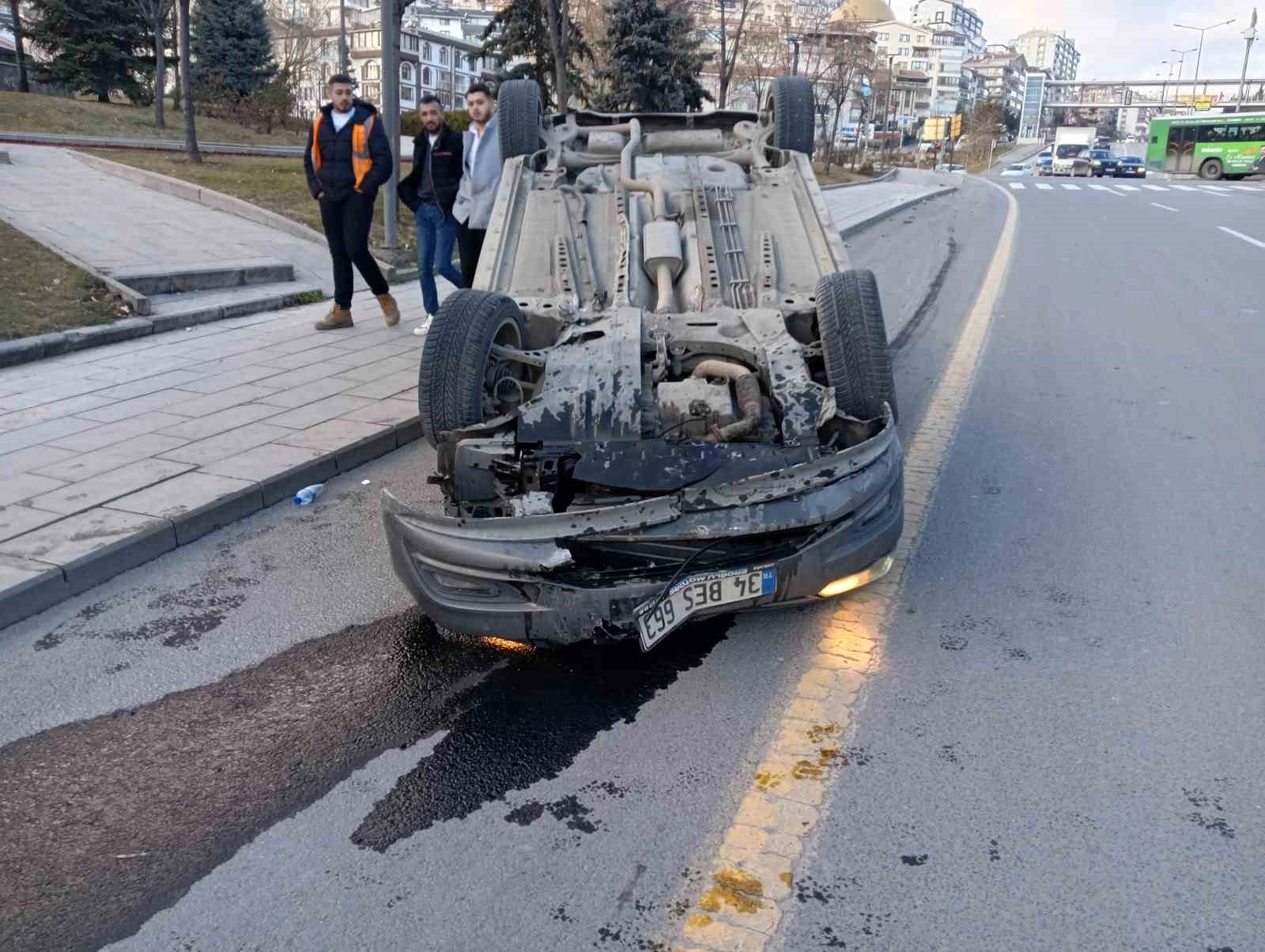 Ankara'da kırmızı ışıkta geçtiği iddia edilen servis aracına çarpmamak için sürücüsünün manevra yaptığı otomobil takla attı.
