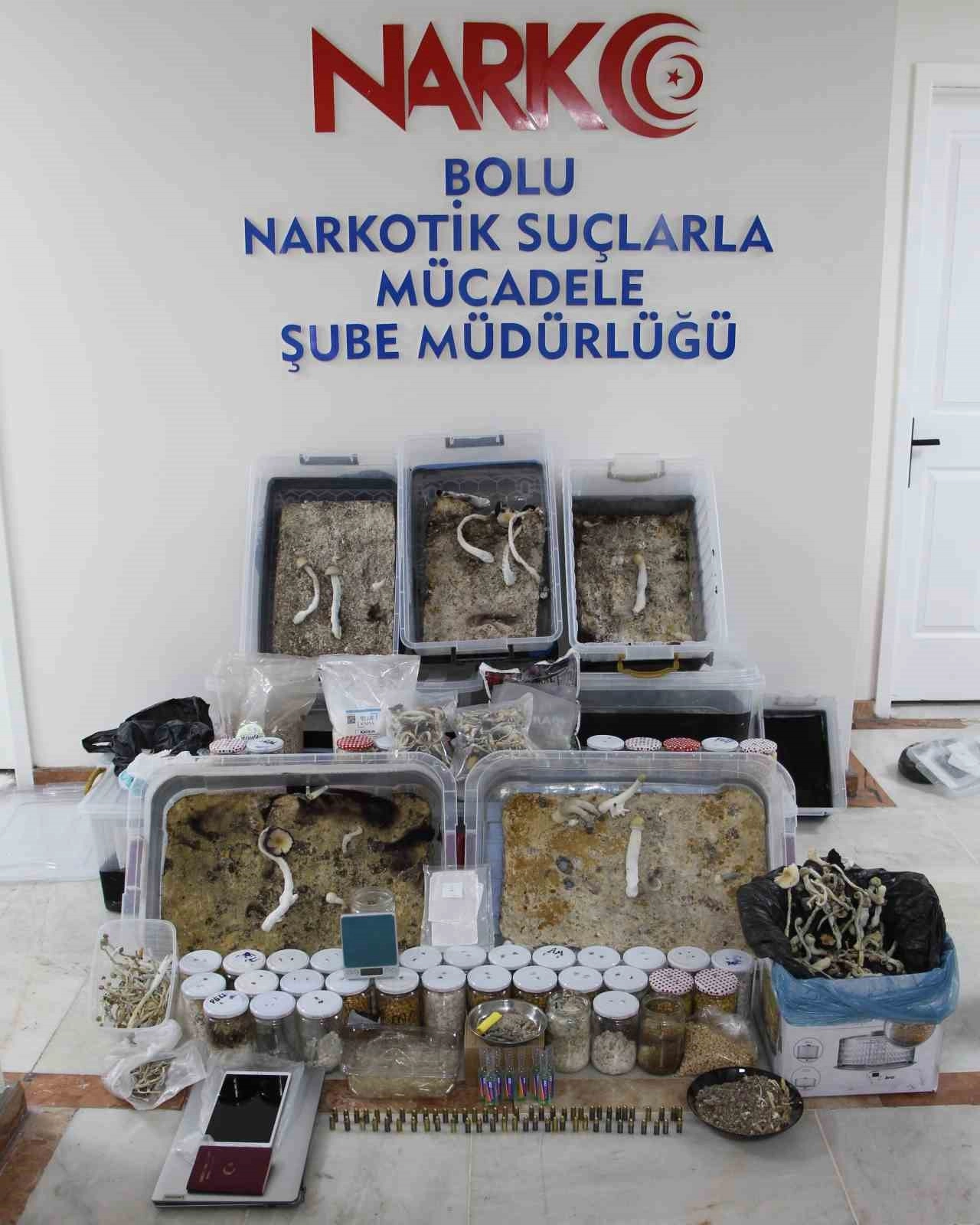 Bolu Emniyet Müdürlüğü, Narkotik Suçlarla Mücadele Şube Müdürlüğü ekipleri tarafından uyuşturucu madde imalat yeri olarak değerlendirilen 2 adrese operasyon düzenlendi. Ekipler tarafından yapılan operasyon neticesinde, 1 bin 750 adet LSD kağıdı, 938,30 gram gelen Psilosin içerikli sihirli mantar, uyuşturucu sihirli mantar yetiştirmede kullanılan çok sayıda cam kavanoz, plastik kutu, boş kapsül, toprak ve çeşitli toz maddeler, 25 adet şeffaf kapsül içerisinde sihirli mantar, 64 adet tabanca fişeği, 1 adet el yapımı patlayıcı, 1,85 gram skunk maddesi, 1 adet hassas terazi ele geçirildi. Olayla ilgili olarak gözaltına alınan 3 şahıs, tutuklanarak cezaevine gönderildi.