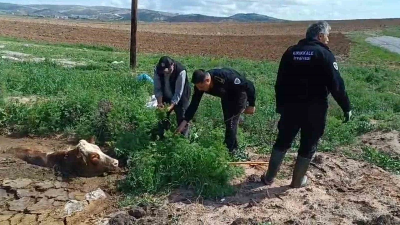 Kırıkkale’de bataklığa saplanan inek, itfaiye ekiplerinin müdahalesiyle kurtarıldı.