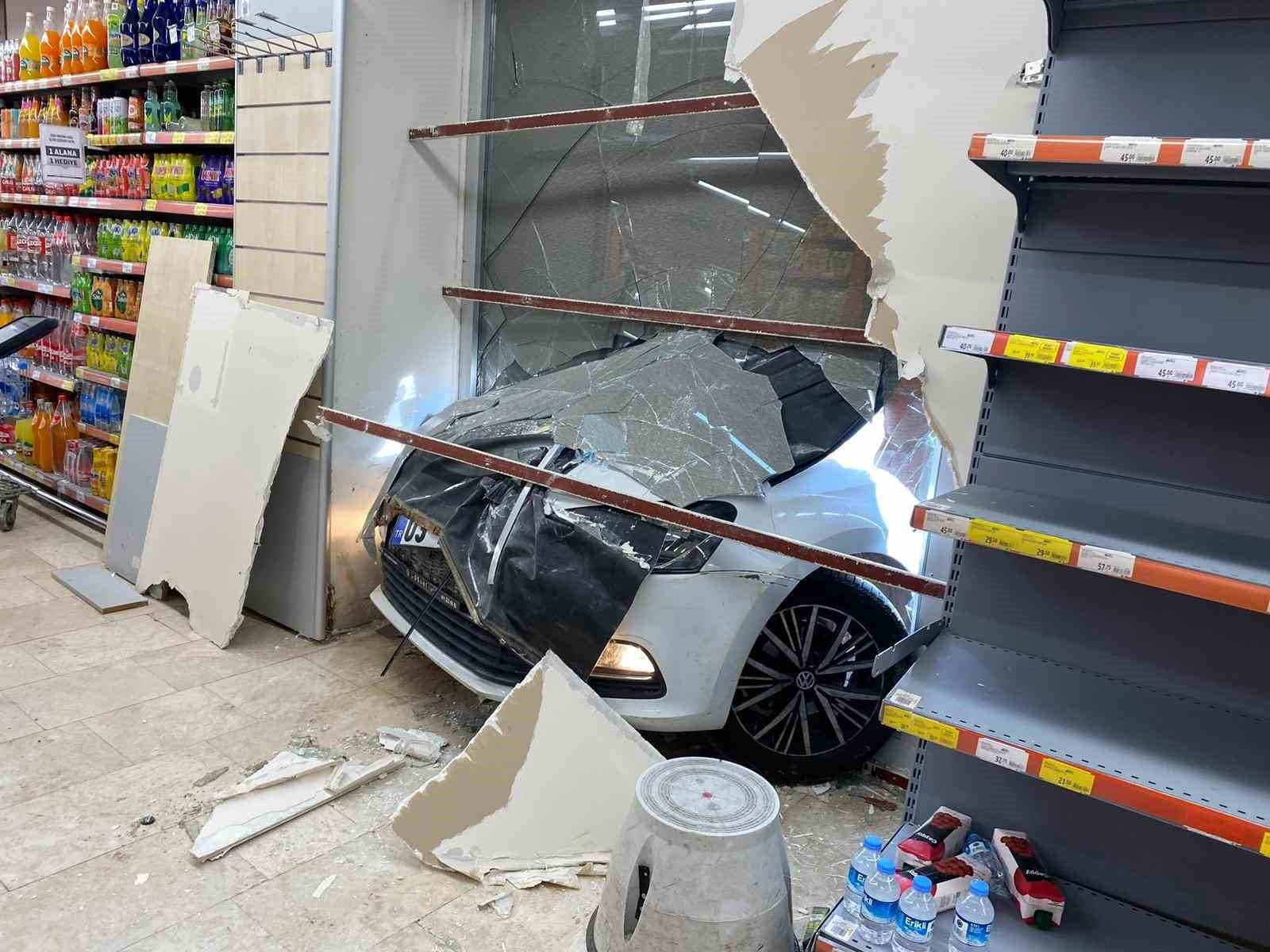 Afyonkarahisar'da bilinmeyen bir nedenle kontrolden çıkan otomobil, kaldırımı aşarak market camından içeri girdi.