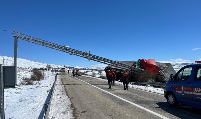 Sivas'ta kontrolden çıkan tır, Elektronik Denetleme Direğine çarpıp bariyerlerde asılı kaldı. Tırda sıkışan sürücü AFAD ekipleri tarafından kurtarıldı.