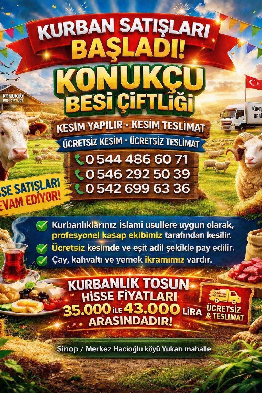 Sinop’ta kurban ibadetini yerine getirmek isteyen vatandaşlar için hazırlıklar hız kazandı. Kentin köklü işletmelerinden biri olan Konukçu Besi Çiftliği, bu yıl da modern ve hijyenik şartlarda kurbanlık satış ve kesim hizmeti sunacağını açıkladı.
