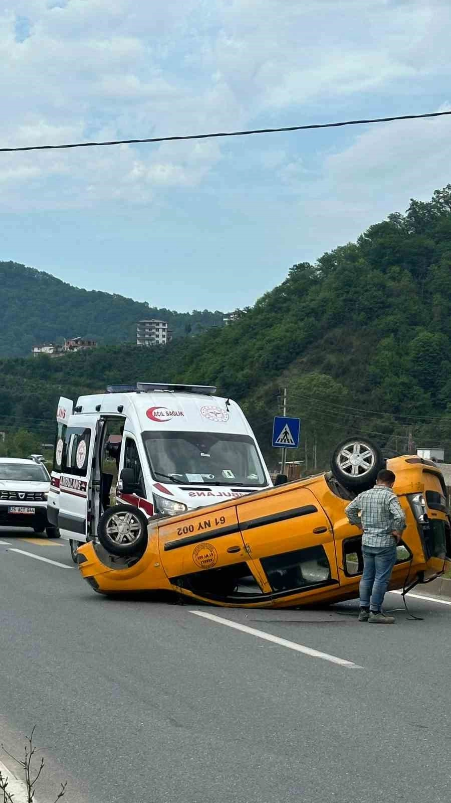 Trabzon'un Araklı ilçesinde ticari taksi sürücüsü köpeğe çarpmamak için manevra yapınca araç takla attı.