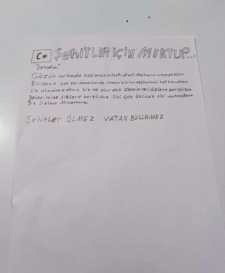 2'nci sınıf öğrencisi bir kız çocuğu ise asker olmak istediğini belirterek, Mehmetçiğe selamlarını iletti. Bir başka çocuk da, "Siz bizim için çok değerlisiniz. Bizler için gözünüzü kırpmadan hayatınızı feda ediyorsunuz. Siz bizim gururumuzsunuz" diye yazdı.
