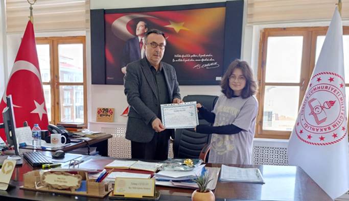 Elde ettiği anlamlı başarı dolayısıyla İlçe Millî Eğitim Müdürü Yılmaz Ceylan tarafından makamında kabul edilen Zeynep Acar’a Başarı Belgesi takdim edilirken,çeşitli hediyeler verildi.