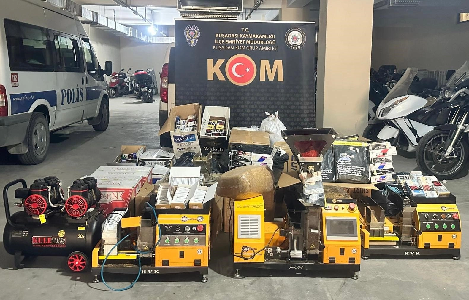 Kuşadası İlçe Emniyet Müdürlüğü Kaçakçılık ve Organize Suçlarla Mücadele Grup Amirliği ekipleri ve İlçe Tarım Müdürlüğü görevlilerinin ortak çalışması sonucu Davutlar Mahallesi'nde kaçak sigara imalatı yapıldığı tespit edilerek operasyon düzenlendi. Operasyonda yapılan aramalarda, 4 adet sigara sarma makinası, 1 adet kompresör, 175 kilogram tütün, 69 bin 400 adet boş makaron, 10 bin adet doldurulmuş sigara, 14 bin adet boş sigara paketi ele geçirildi. Ele geçirilen bu malzemelere el konuldu. Operasyonda yakalanan M.T. isimli şahıs hakkında gerekli yasal işlemlere başlanıldı.