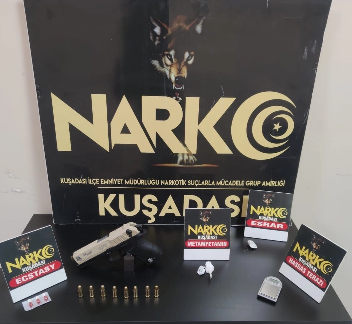 Kuşadası ilçe Emniyet Müdürlüğü Narkotik Suçlarla Mücadele Büro Amirliği ve Devriye Ekipler Amirliği ekiplerinin ortaklaşa olarak yaptıkları çalışma neticesinde Türkmen Mahallesinde Cadde üzerinde 2 şahıs yakalandı. B.E. isimli şahsın yapılan ev aramasında 2 parça halinde daralı toplam 3,75 gram metamfetamin, 3 adet Yeşil Reçeteye tabi hap, 1 adet çalışır vaziyette hassas terazi, 1 adet ruhsatsız tabanca, tabancaya ait 1 adet şarjör ve şarjöre takılı vaziyette 8 adet dolu fişek ele geçirildi. Z.E. isimli şahsın yapılan üst aramasında daralı 0,57 gram Esrar ve 1 adet hassas terazi ele geçirildi. Şahıslar gerekli yasal işlemler için emniyete götürüldü.