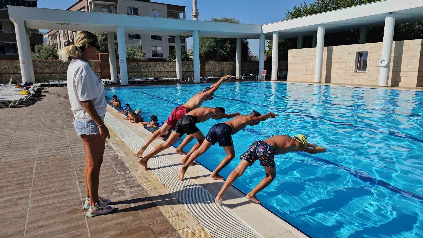 Aydın'ın Kuyucak ilçesinde yaz döneminde açılan yüzme kursları büyük ilgi gördü. Modern havuzlarda eğitmen ve cankurtaranlar eşliğinde yüzme öğrenen çocuklar öğrendiklerini sergilemek üzere çalışmalarını sürdürüyor.