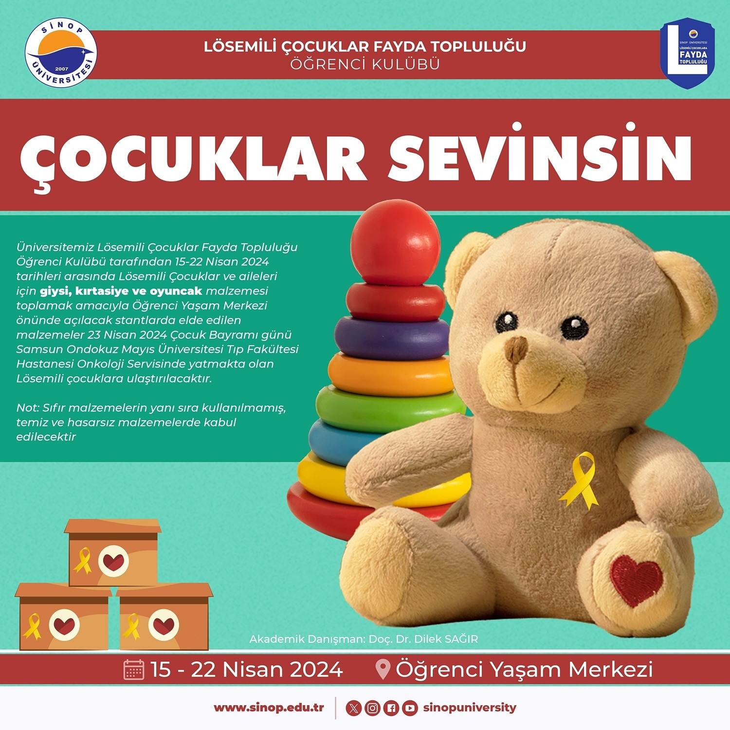 15-22 Nisan 2024 tarihleri arasında Sinop Üniversitesi Öğrenci Yaşam Merkezi önünde kurulacak stantlarda, giysi, kırtasiye ve oyuncak malzemeleri toplanacak. Kulüp yetkilileri, kampanyanın amacının, lösemili çocuklar ve ailelerine moral ve destek sağlamak olduğunu belirtti. Toplanacak malzemelerin, 23 Nisan 2024 Çocuk Bayramı günü, Samsun Ondokuz Mayıs Üniversitesi Tıp Fakültesi Hastanesi Onkoloji Servisi'nde yatan lösemili çocuklara ulaştırılacağı ifade edildi. Kampanya kapsamında sıfır malzemelerin yanı sıra kullanılmamış, temiz ve hasarsız malzemelerin de kabul edileceği bildirildi.
