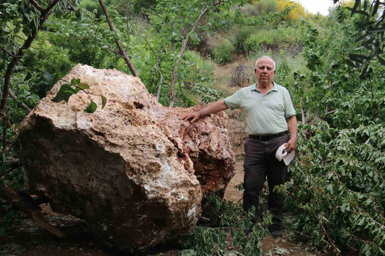 10 ton kaya parçasının bahçesine düştüğünü ifade eden Selahattin Altınöz, "Biz burada kayısı toplamaya geldik. Birdenbire uçarak üstümüze geldi. Nereden geldiğini biliyoruz ama ne zaman geleceğini kimse bilmiyor. Çünkü yukarıda taş ocağı var. Ben mimarım ve teknik şeyleri anlarım. Aşağı yukarı bu taş 4 metreküp. 4 metreküp bir taşın özgül ağırlığı 2,5 ton metreküp bu da 10 ton civarında. Tabii ki korktuk ben o anda burada değildim ama bizimkiler kaçıştılar. Hatta bir kova kayısı vardı dökülmüştü. Bu yeniydi ama 10-15 gün önce komşumuzun bahçesinde aynı şey oldu. Komşumun orada evi yok. Ev olmadığı için sadece ağaçlara zarar verildi" dedi.
