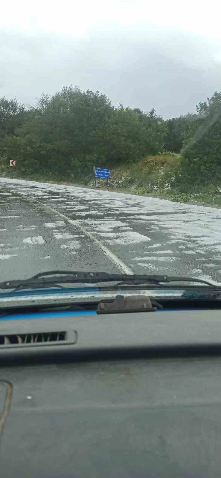 Kırklareli Demirköy ilçesi Mahya Dağı bölgesinde ceviz büyüklüğündeki doluya yakalanan sürücüler, benzinliğe sığınmak zorunda kaldı.