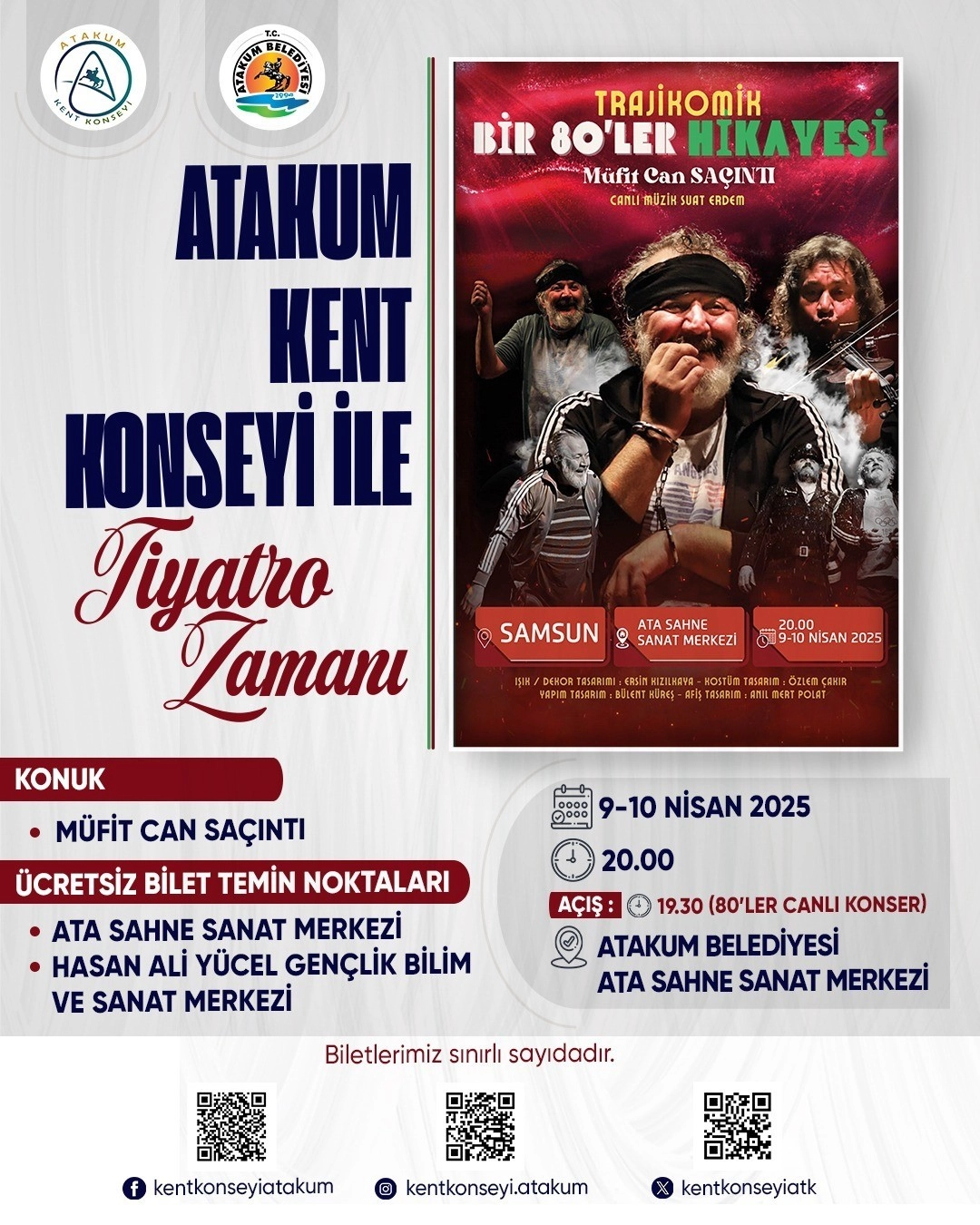 Atakum Kent Konseyi Başkanı Tuncay Seven, "Atakum Kent Konseyi ile Tiyatro Zamanı" başlığıyla düzenlenen etkinlikle tiyatro izleme fırsatı bulamayan kesimlere sanatı ulaştırmayı amaçladıklarını belirterek, "Usta Sanatçımız Müfit Can Saçıntı, 'Bir Trajikomik 80'ler Hikayesi' ile Ata Sahne'de halkımızla buluşuyor. Yaşadığımız zorlu günlerde, sanatın birleştirici gücünü göstermesi açısından son derece önemli bir organizasyon olacağı düşüncesindeyiz. Atakum Kent Konseyi ve Atakum Belediyesi iş birliğiyle tamamen halka destek olma ve nefes aldırma amacı güderek organize ettiğimiz etkinliğin kentimizde, tiyatro kültürünün yayılmasına da katkı sağlayacağına inanıyoruz. Samsun ve çevresindeki tüm tiyatro severleri bu özel etkinliğimize bekliyoruz" dedi.