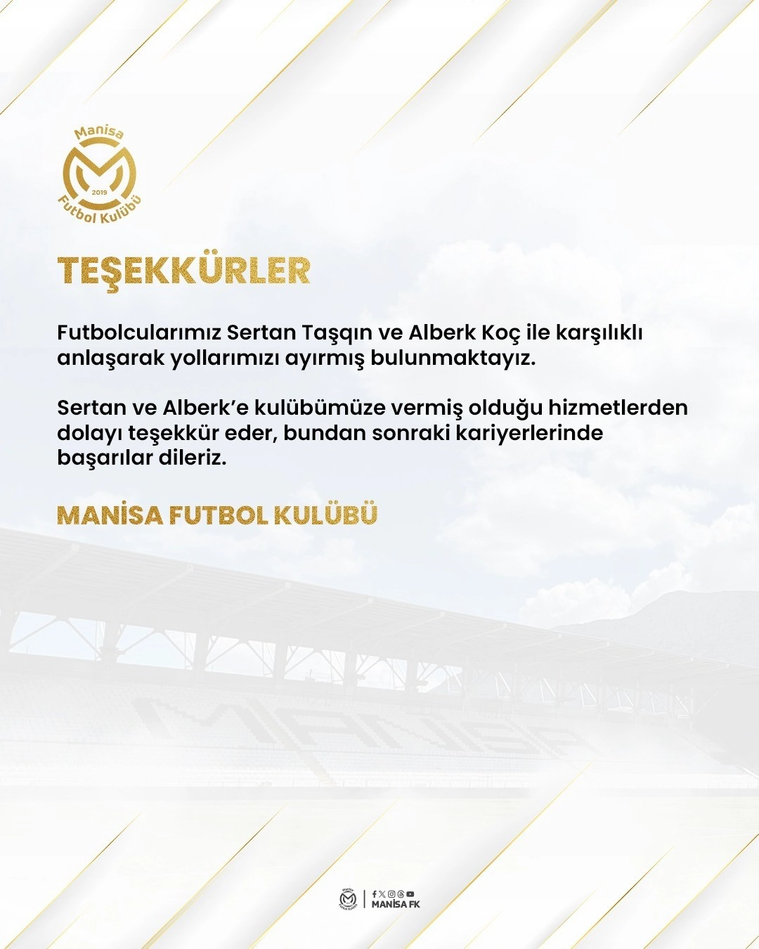 Manisa FK'ın resmi sosyal medya hesabından yapılan açıklamada, "Futbolcularımız Sertan Taşqın ve Alberk Koç ile karşılıklı anlaşarak yollarımızı ayırmış bulunmaktayız. Sertan ve Alberk'e kulübümüze vermiş olduğu hizmetlerden dolayı teşekkür eder, bundan sonraki kariyerlerinde başarılar dileriz" ifadelerine yer verildi.
