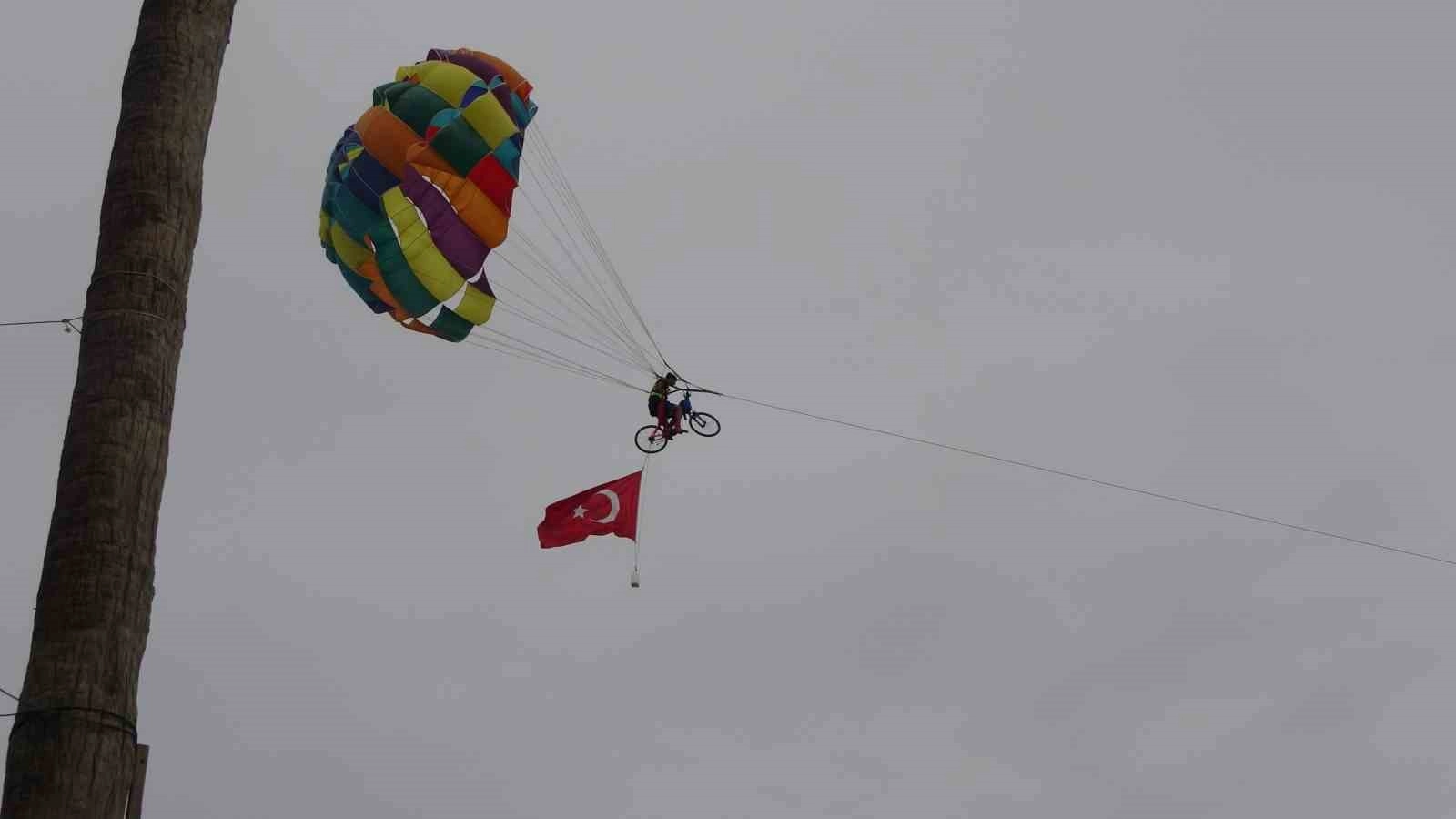 59. Cumhurbaşkanlığı Bisiklet Turu'nun Marmaris finiş etabında paraşüt ile gökyüzünde süzülen bisikletli dikkatleri üstüne topladı. Rengarenk bir deniz paraşütüyle bisiklet üstünde kırmızı beyaz Türk bayrağı ile şov yapan Marmaris Su Üstü Sporları Kooperatifi'ne bağlı sporcu izleyenleri adeta kendine hayran bıraktı. Şovu düzenleyen Marmaris Su Üstü Sporları Kooperatifi Yönetim Kurulu Üyesi Salih Tunç; "Marmaris'te bu aktiviteyi yıllardır bir sembol haline getirdik. Marmaris'teki cumhurbaşkanlığı yarışında bu şovu her yıl yapıyoruz. Kooperatif olarak bu vazifeyi yerine getirdiğimizden dolayı gururluyuz" dedi.