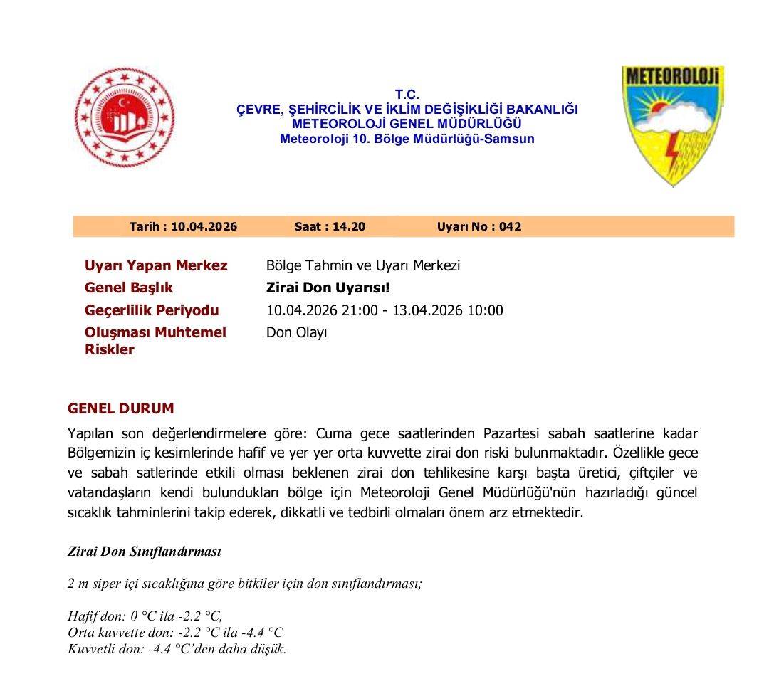 Meteoroloji 10. Bölge Müdürlüğü tarafından yapılan açıklamada, 10 Nisan 2026 Cuma günü gece saatlerinden itibaren 13 Nisan 2026 Pazartesi sabah saatlerine kadar bölgenin iç kesimlerinde zirai don riskinin beklendiği bildirildi.