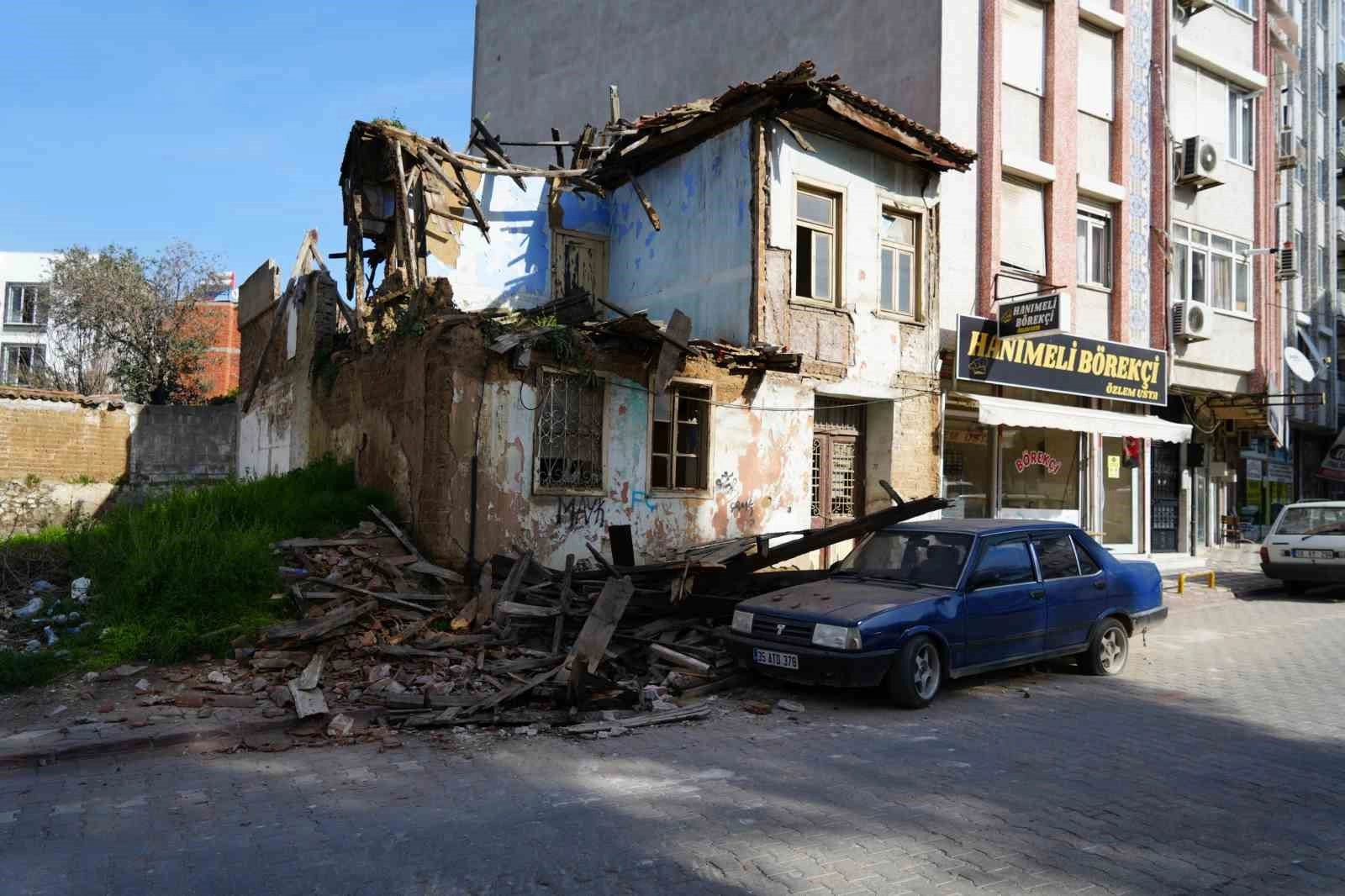 Balıkesir'in Edremit ilçesinde metruk bir bina park halindeki otomobilin üzerine çöktü.