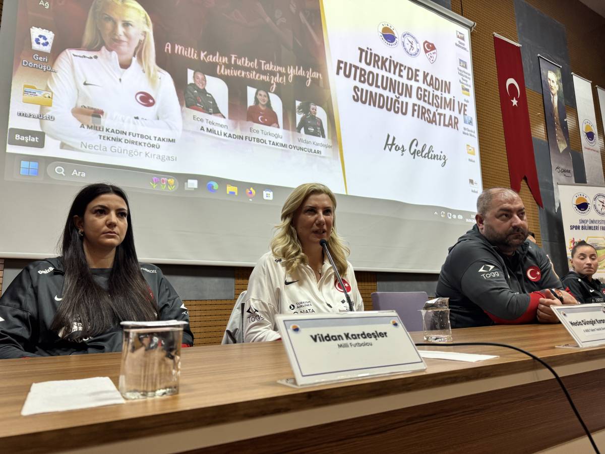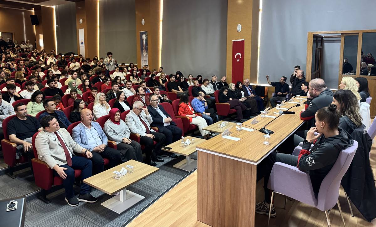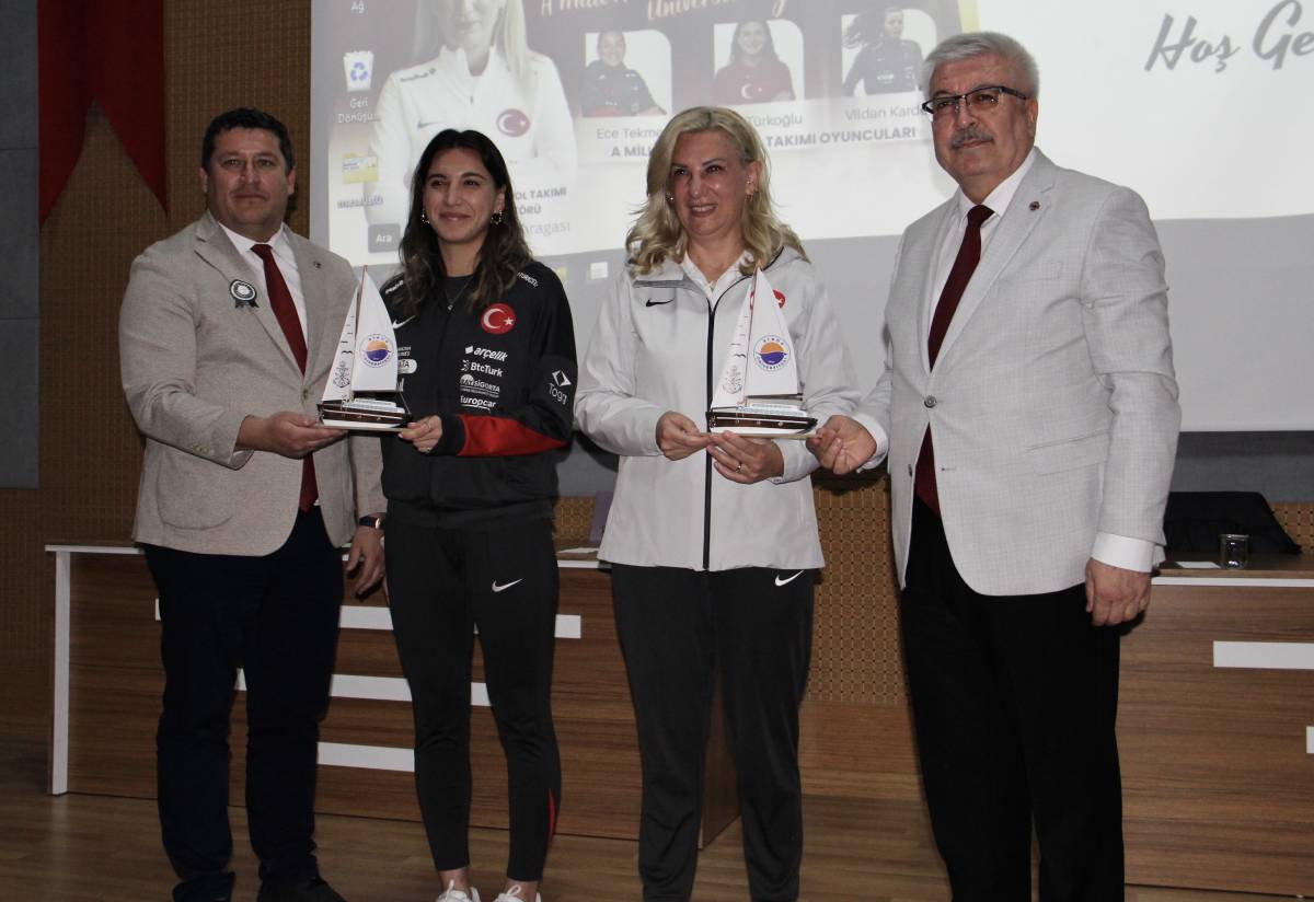 Şehit Ömer Can Açıkgöz Konferans Salonu’nda gerçekleştirilen panelde, teknik direktör Kıragası ve milli oyuncular Vildan Kardeşler, Ece Tekmen ve Ece Türkoğlu tecrübelerini öğrencilerle paylaştı.