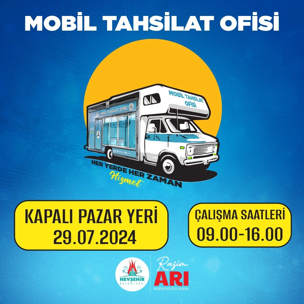 Nevşehir Belediyesi Mobil Tahsilat Ofisi, 29 Temmuz 2024 Pazartesi günü Kapalı Pazar Yeri'nde hizmet verecek.