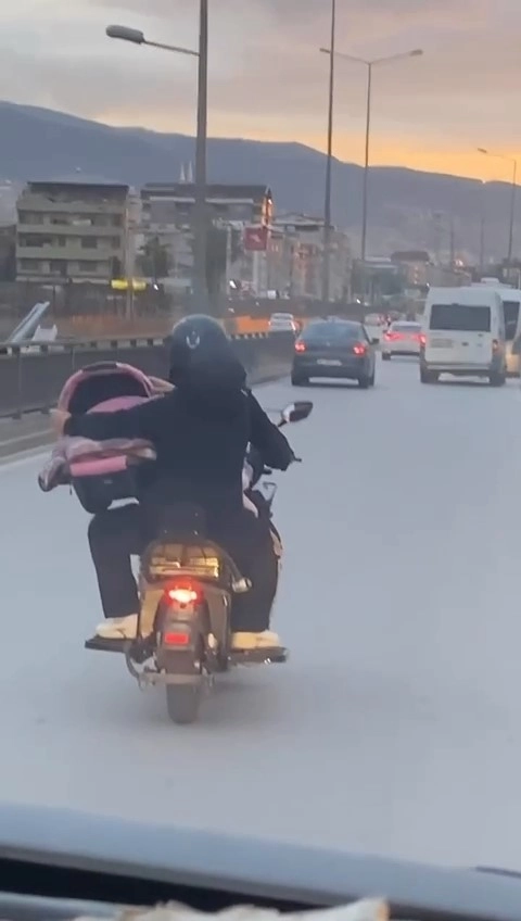 Bursa'da işlek cadde üzerinde ilerleyen motosiklet sürücüsü bebeği pusette taşıdı.