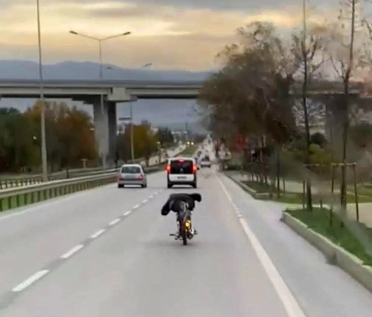 Bursa'nın Osmangazi ilçesi Ovakça mevkiinde meydana gelen olayda, kasksız motosiklet sürücüsü, motosikletiyle ilerlediği sırada yaptığı hareketlerle tehlikeye davetiye çıkardı. Yatarak kullandığı motosikletle adeta ölümle dans eden sürücünün tehlikeli yolculuğu cep telefonu kamerasıyla saniye saniye kaydedildi. Görüntülerde kasksız motosiklet sürücüsünün, iki teker üzerinde yatarak ilerlemesi yer alıyor.