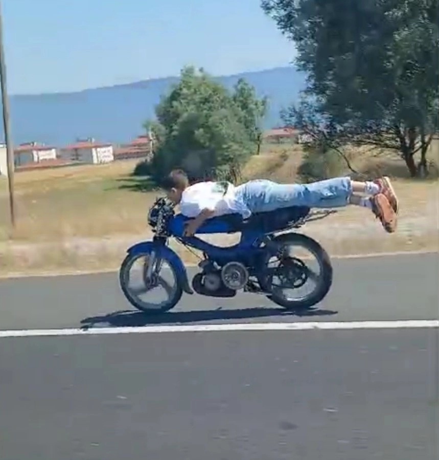 Olay, D-100 Karayolu Dağkent Mahallesi mevkiinde meydana geldi. Ankara istikametinde seyreden otomobilin içerisindeki yolcular, aynı istikamette giden motosikletli gencin tehlikeli hareketlerini görünce şaşkınlıklarını gizleyemeyerek o anları kayda aldı. Plakasız motosikletin üzerine yüzüstü yatarak seyir halinde olan genç adeta kazaya davetiye çıkardı.