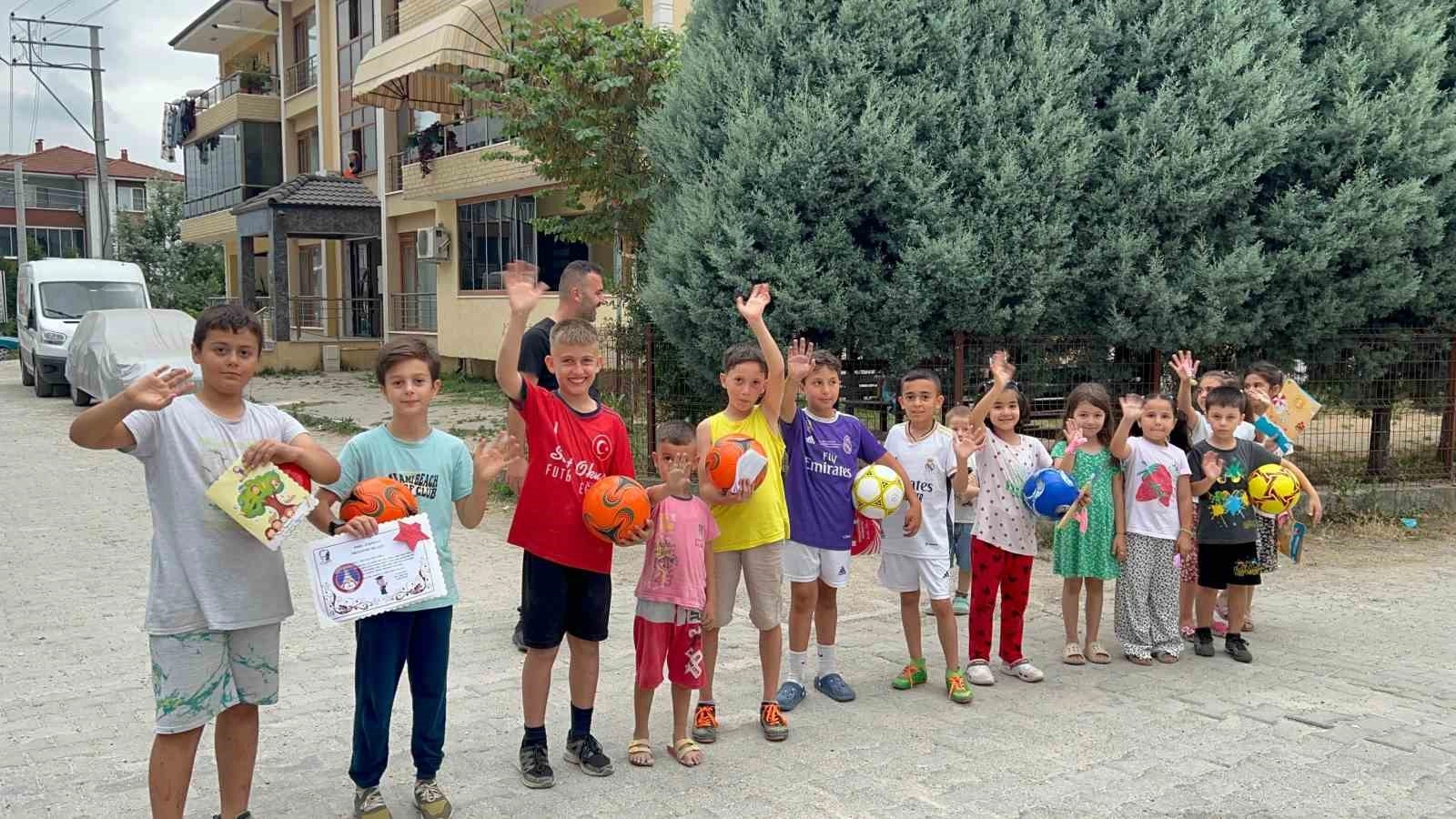 Sakarya'nın Akyazı ilçesinde karnelerini alarak 86 günlük yaz tatiline giren öğrencilere, mahalle muhtarı top ve anahtarlık hediye etti.