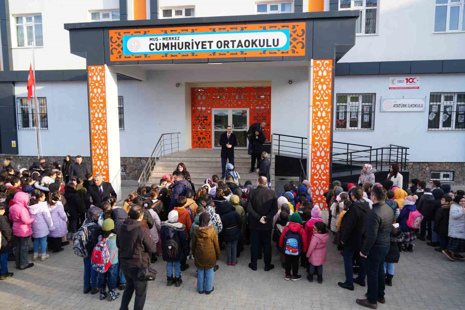 2024-2025 eğitim öğretim yılının ikinci döneminin başlaması nedeniyle Muş Milli Eğitim Müdürlüğü tarafından Cumhuriyet Ortaokulunda düzenlenen tören, saygı duruşunda bulunulması ve İstiklal Marşı'nın okunması ile başladı. Törene katılan Milli Eğitim Müdürü Enver Kıvanç, her başlangıcın beraberinde yeni umutları getirdiğini belirterek, "2024-2025 eğitim öğretim yılının ara tatiline 20 Ocak'ta başlamıştık, bugün tatilimizi noktalamış bulunuyoruz. İki haftalık tatil sürecinde hem öğretmenlerimiz hem öğrencilerimiz dinlenmiş ve enerjilerini toplayarak bugün tekrar okullarına dönmelerine hepimiz müsaade etmekteyiz. Türkiye yüzyılı maarif modeli ışığında çocuklarımızın daha yetkin ve erdemli bireyler olarak yetiştirmek için öğretmenlerimizle birlikte çaba sarf edeceğiz. Umarım bu eğitim öğretim yılının daha yetkin daha verimli ve başarılı bir şekilde geçireceğiz. Öğretmen ve öğrencilerimizin dinlenmiş bir şekilde döndüklerine yürekten inanıyorum. İkinci dönemin başta ülkemize olmak üzere ilimize hayırlı olmasını dilerim. İlimizde bugün itibari ile 697 okulumuzda 104 bin 641 öğrencimiz, 6 bin 663 öğretmenimiz ile eğitim öğretime başladık. Hepimize hayırlı ve uğurlu olsun" dedi.