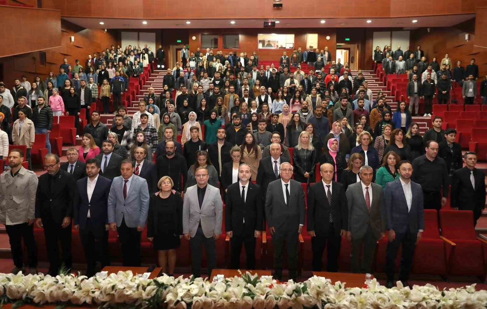 09.05'te siren çalınması ile birlikte saygı duruşunda bulunulmasıyla başlayan tören İstiklal Marşı'nın okunmasıyla devam etti. Günün anlam ve önemine ilişkin konuşma yapan Rektör Yardımcısı Prof. Dr. Hamdi Doğan; "1938 yılında sonsuzluğa uğurladığımız büyük Atatürk; azmi, kararlılığı, ileri görüşlülüğü ve önderliğiyle nasıl ki yaşamında milletimize bağımsızlık yolunda liderlik yaptıysa, bugün de bize bıraktığı mirasla yolumuzu aydınlatıyor. Asil Türk milletinin sinesindeki kahramanlığın tecellisi olan Gazi Mustafa Kemal Atatürk, 85 yıldır olduğu gibi bundan sonra da muasır medeniyetler seviyesinin üstüne çıkma yolunda bizlere ilham kaynağı olacak, dünya tarihine altın harflerle yazılan adıyla geleceğimize ışık tutacak" dedi. Anma töreniyle başlayan program, Şehit Ömer Halisdemir Kongre ve Kültür Merkezi'ndeki Atatürk ve Milli Egemenlik konferansıyla devam etti. Programın açılış konuşmasını yapan Rektör Prof. Dr. Hasan Uslu, her milletin kimliğinin ana unsurlarından birinin o milletin kültürel değerleriyle birlikte içinden çıkardığı kahramanlar olduğunu belirtti. Gazi Mustafa Kemal Atatürk'ün de Türk milleti için böyle bir kahraman olduğuna vurgu yapan Rektör Uslu, konuşmasının devamında; "Gazi Paşa ve silah arkadaşlarının Türk milletinin karakterinden ilhamla verdikleri mücadeleler, bugün ülkemizin ve milletimizin dünyada saygın bir yer edinmesini sağlamıştır. Onların kanla ve irfanla kurdukları Cumhuriyet'imiz, bir asrı devirmiş ve yeni yüzyıla Türkiye Cumhuriyeti ismiyle damgasını vurmak için bugünlere gelmiştir" ifadelerini kullandı. Program; Fen Edebiyat Fakültesi Tarih Bölümü Öğretim Üyesi Doç. Dr. İbrahim Öztürk'ün 'Atatürk ve Milli Egemenlik' konferansıyla devam etti.