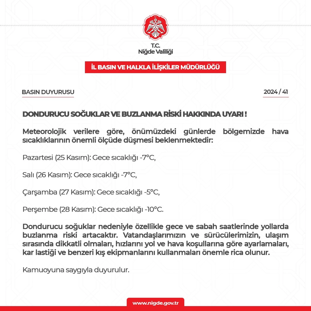 Valilik tarafından yapılan açıklamada; "Meteorolojik verilere göre, önümüzdeki günlerde bölgemizde hava sıcaklıklarının önemli ölçüde düşmesi beklenmektedir. 25 Kasım Pazartesi gece hava sıcaklığı -7C, 26 Kasım Salı gece hava sıcaklığı -7C, 27 Kasım Çarşamba gece hava sıcaklığı -5 derece ve 28 Kasım Perşembe gecesi hava sıcaklığının -10 derece olması bekleniyor. Dondurucu soğuklar nedeniyle özellikle gece ve sabah saatlerinde yollarda buzlanma riski artacaktır. Vatandaşlarımızın ve sürücülerimizin, ulaşım sırasında dikkatli olmaları, hızlarını yol ve hava şartlarına göre ayarlamaları, kar lastiği ve benzeri kış ekipmanlarını kullanmaları önemle rica olunur" ifadelerine yer verildi.