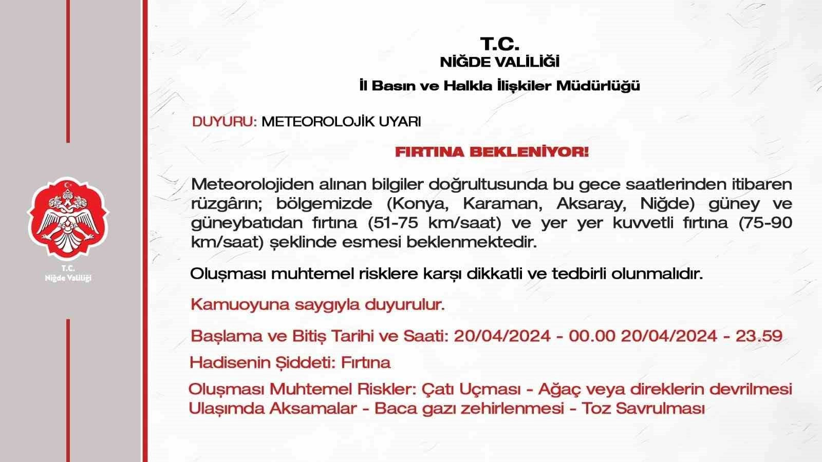 Valilikten yapılan açıklamada; 20 Nisan Cumartesi günü güney ve güneybatıdan fırtına beklendiği ifade edildi. Niğde Valiliği tarafından yapılan duyuruda; "Meteorolojiden alınan bilgiler doğrultusunda bu gece saatlerinden itibaren fırtına bekleniyor. Meteorolojiden alınan bilgiler doğrultusunda bu gece saatlerinden itibaren rüzgârın; bölgemizde (Konya, Karaman, Aksaray, Niğde) güney ve güneybatıdan fırtına (51-75 km/saat) ve yer yer kuvvetli fırtına (75-90 km/saat) şeklinde esmesi bekleniyor. Oluşması muhtemel risklere karşı dikkatli ve tedbirli olunmalıdır" ifadelerine yer verildi. Niğde Valiliği oluşması muhtemel risklere karşı da uyarılarda bulundu.
