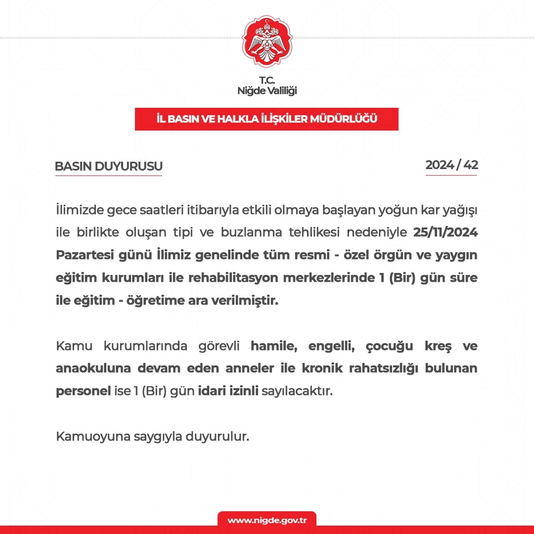 Niğde'de yoğun kar yağışı, tipi ve muhtemel buzlanma nedeniyle, 25 Kasım Pazartesi günü il genelindeki ilk ve orta dereceli okullar tatil edildi. Kamu kurumlarında görevli hamile, engelli, çocuğu kreş ve anaokuluna devam eden anneler ile kronik rahatsızlığı bulunan personel ise 1 gün idari izinli sayılacak. Niğde Valiliği tarafından yapılan açıklamada; "İlimizde gece saatleri itibarıyla etkili olmaya başlayan yoğun kar yağışı ile birlikte oluşan tipi ve buzlanma tehlikesi nedeniyle 25.11. 2024 Pazartesi günü ilimiz genelinde tüm resmi - özel örgün ve yaygın eğitim kurumları ile rehabilitasyon merkezlerinde 1 gün süre ile eğitim, öğretime ara verilmiştir. Kamu kurumlarında görevli hamile, engelli, çocuğu kreş ve anaokuluna devam eden anneler ile kronik rahatsızlığı bulunan personel ise 1 gün idari izinli sayılacaktır" ifadelerine yer verildi.