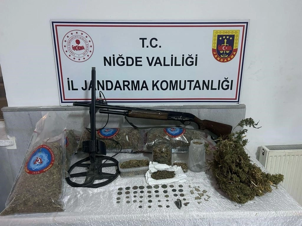 Niğde İl Jandarma Komutanlığı ekiplerince, kaçakçılık ve organize suçlarla mücadele çerçevesinde Ulukışla ilçesine bağlı Hasangazi köyünde belirlenen adrese operasyon yapıldı. Yapılan operasyonda, 1 adet el dedektörü, 40 adet sikke, 2 adet obje, çeşitli miktarlarda uyuşturucu madde ve 1 adet ruhsatsız av tüfeği ele geçirildi.
