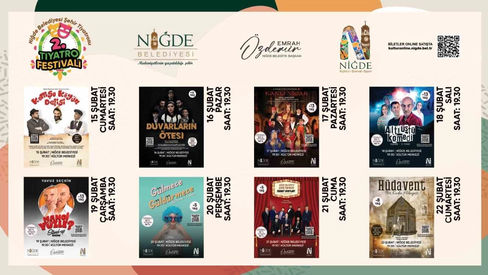 Festival, 15-22 Şubat 2025 tarihleri arasında gerçekleşecek. Tüm oyunlar, Niğde Belediyesi Kültür Merkezi'nde saat 19.30'da sahnelenecek. Sanatseverler hem usta tiyatrocuların sahnelediği oyunları hem de Niğde Belediyesi Şehir Tiyatrosu'nun özel gösterimlerini izleme fırsatı bulacak. Festivalde sahnelenecek tüm oyunlara giriş için biletler, kulturonline.nigde.bel.tr adresinden veya Niğde Belediyesi Kültür Merkezi gişelerinden temin edilebilecek. Niğde Belediyesi, şehrin kültürel yaşamını zenginleştirmeye devam ediyor. Tiyatro Festivali sayesinde vatandaşlar, sanatın büyülü dünyasında keyifli vakit geçirirken, Niğde'nin kültürel mirasına da katkıda bulunacaklar. Başkan Emrah Özdemir, festivalin Niğde için önemli bir kültürel etkinlik olduğunu belirterek, tüm vatandaşları tiyatronun büyülü dünyasına adım atmaya davet ederek; "Gelin, hep birlikte sanatın tadını çıkaralım!" diyerek sözlerini tamamladı. Festivalin programı şu şekilde: