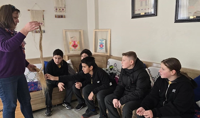 Usta öğretici Asuman Yılmaz’dan, Ayancık keteninin bitki biçiminden el emeği ürünlere dönüşme serüvenini dinleyen öğrenciler, atölyedeki çalışmaları yakından görme ve deneyimleme fırsatı buldular.