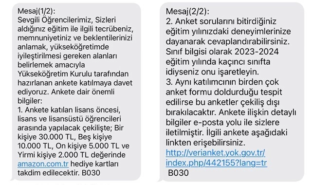 Öğrencilerin cep telefonlarına gönderildiği öğrenilen mesajda, "Sevgili öğrencilerimiz, sizleri aldığınız eğitim ile ilgili tecrübeniz, memnuniyetiniz ve beklentilerinizi anlamak, yükseköğretimde iyileştirilmesi gereken alanları belirlemek amacıyla Yükseköğretim Kurulu tarafından hazırlanan ankete katılmaya davet ediyoruz. Ankete katılan lisans öncesi, lisans ve lisansüstü öğrencileri arasında yapılacak çekilişte 1 kişiye 30 bin TL, 5 kişiye 10 bin TL, 10 kişiye 5 bin TL ve 20 kişiye 2 bin TL değerinde hediye kartları takdim edilecektir. Anket sorularını bitirdiniz eğitim yılınızdaki deneyimlerinize dayanarak cevaplandırabilirsiniz. Sınıf bilgisi olarak 2023-2024 eğitim yılında kaçıncı sınıfta idiyseniz onu işaretleyin. Aynı katılımcının birden çok anket formu doldurduğu tespit edilirse bu anketler çekiliş dışı bırakılacaktır" ifadeleri yer aldı.