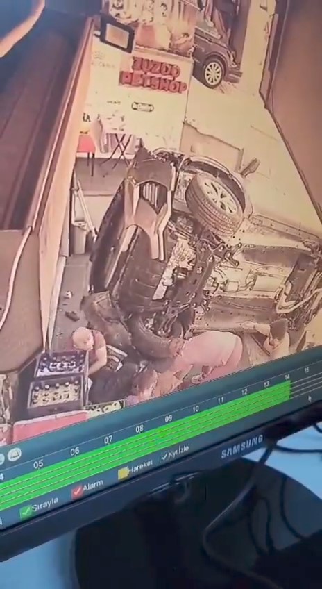 Güvenlik kamerası görüntülerde Hülya Y.'nin kullandığı araç hızla gelip önce kaldırıma, ardından merdivenlere çıkıp işyeri önünde oturan üç kişiye çarptığı ve kazanın ardından otomobilin ters yattığı görülüyor.