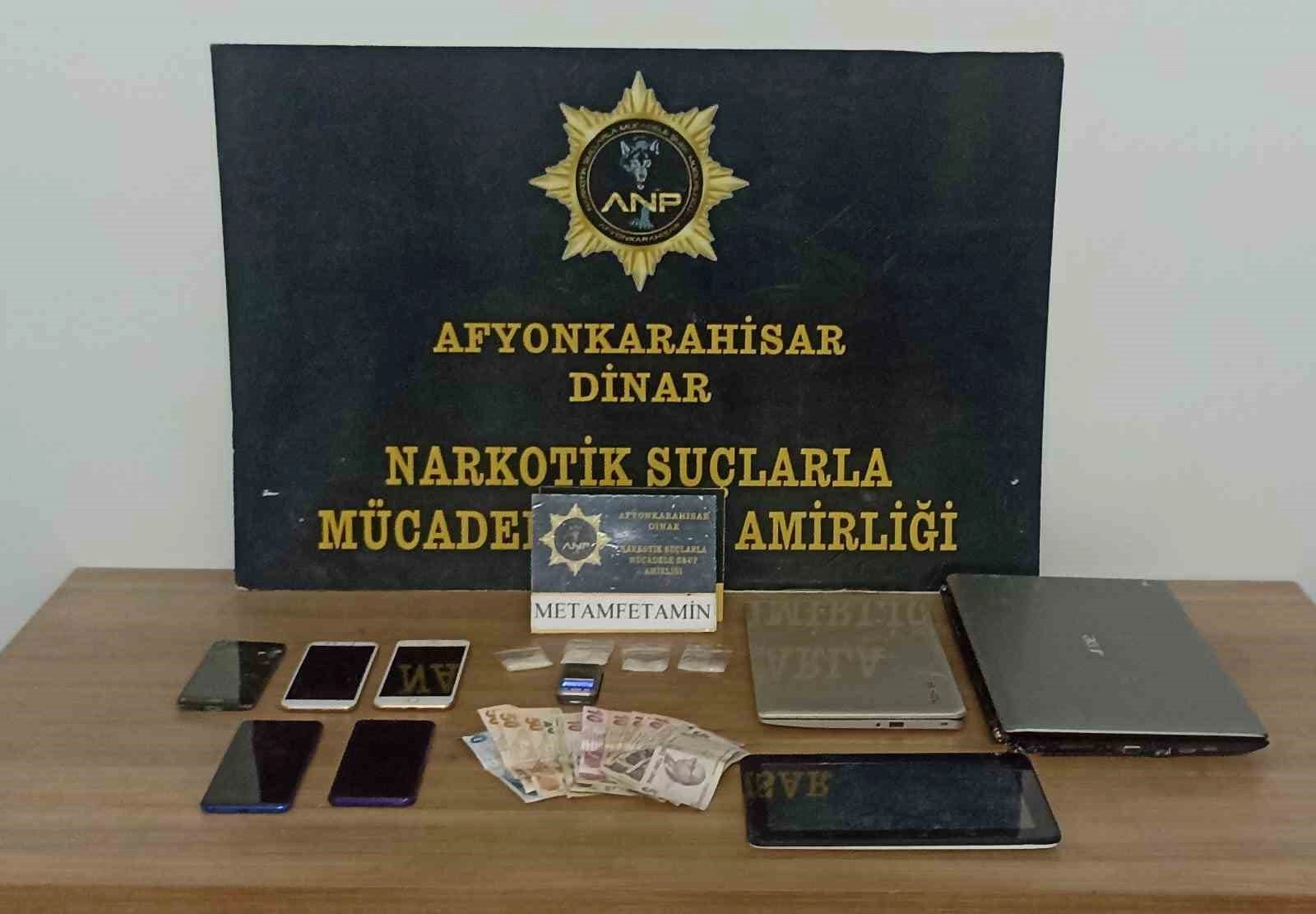 Olay, Dinar ilçesinde meydana geldi. Edinilen bilgilere göre, Dinar İlçe Emniyet Müdürlüğüne bağlı Narkotik Suçlarla Mücadele Büro Amirliği ekipleri yaptıkları yol kontrolünde şüphe üzerine bir otomobili durdurmak istedi. Ancak sürücü ihtara uymayarak kaçmaya başladı. Bir süre sonra aracı bırakan sürücü daha sora yaya olarak kaçmaya başladı. Kısa süreli bir kovalamaca sonrası şahıs yakalandı. Yapılan sorgulamada şahsın kimliğinin A.M.B., olduğu tespit edilirken, araçta ve şahsın üzerinde yapılan aramada ise 11,04 gram metamfetamin, hassas terazi, suçtan elde edildiği değerlendirilen 400 TL para, laptop, tablet ve 5 adet cep telefonu ele geçirildi.