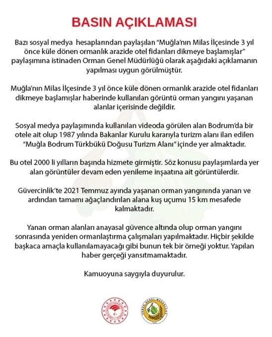 Orman Genel Müdürlüğü, bazı sosyal medya hesaplarında yer alan paylaşımlara istinaden kamuoyu açıklaması yayımladı. Orman Genel Müdürlüğü yaptığı açıklamada, 3 yıl önce Muğla'nın Milas ilçesinde yanan ormanlık araziyle ilgili yapılan haberlerin gerçeği yansıtmadığını bildirerek, "Muğla'nın Milas ilçesinde 3 yıl önce küle dönen ormanlık arazide otel fidanları dikilmeye başlamışlar haberinde kullanılan görüntü orman yangını yaşanan alanlar içerisinde değildir. Sosyal medya paylaşımında kullanılan videoda görülen alan Bodrum'da bir otele ait olup 1987 yılında Bakanlar Kurulu kararıyla turizm alanı ilan edilen 'Muğla Bodrum Türkbükü Doğusu Turizm Alanı' içinde yer almaktadır. Bu otel 2000'li yılların başında hizmete girmiştir. Söz konusu paylaşımlarda yer alan görüntüler devam eden yenileme inşaatına ait görüntülerdir. Güvercinlik'te 2021 Temmuz ayında yaşanan orman yangınında yanan ve ardından tamamı ağaçlandırılan alana kuş uçumu 15 kilometre mesafede kalmaktadır. Yanan orman alanları anayasal güvence altında olup orman yangını sonrasında yeniden ormanlaştırma çalışmaları yapılmaktadır. Hiçbir şekilde başkaca amaçla kullanılmayacağı gibi bunun tek bir örneği yoktur. Yapılan haber gerçeği yansıtmamaktadır" ifadelerine yer verdi.