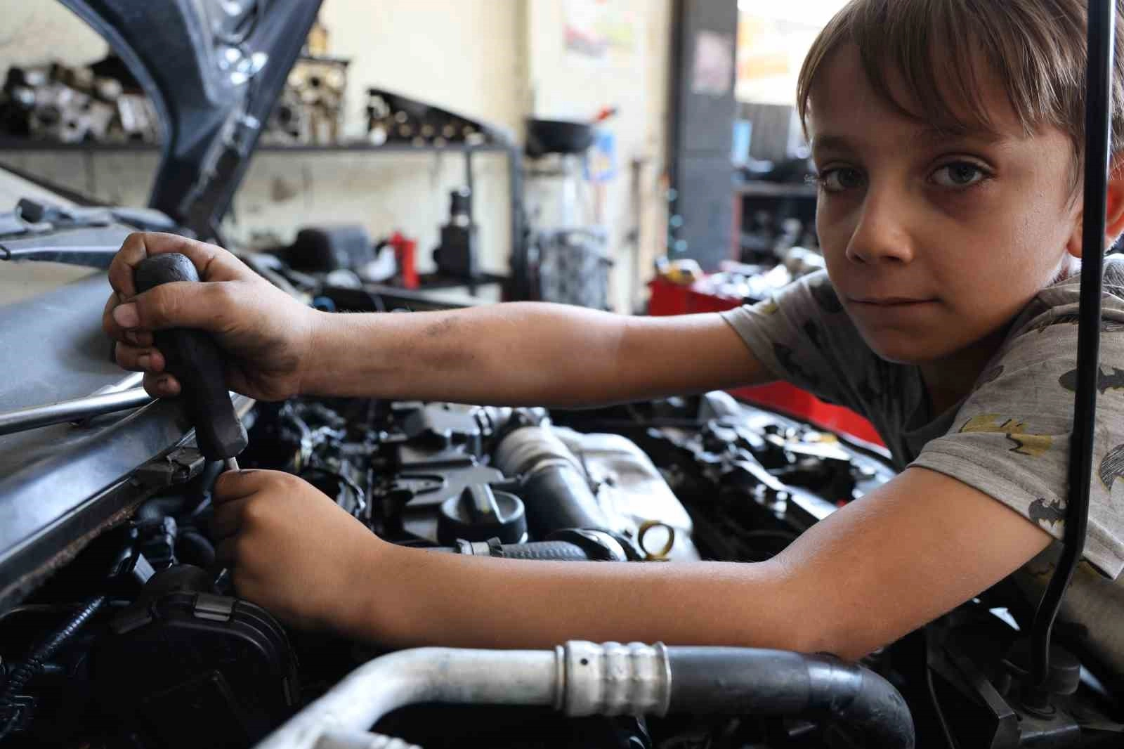 Kahramanmaraş'ta 5. sınıfa giden 11 yaşındaki Muhammet Emin Kaya, babasının desteği ile ağabeyinin iş yeri olan Küçük Sanayi Sitesi'ndeki oto tamir ve bakım servisinde çalışıyor.