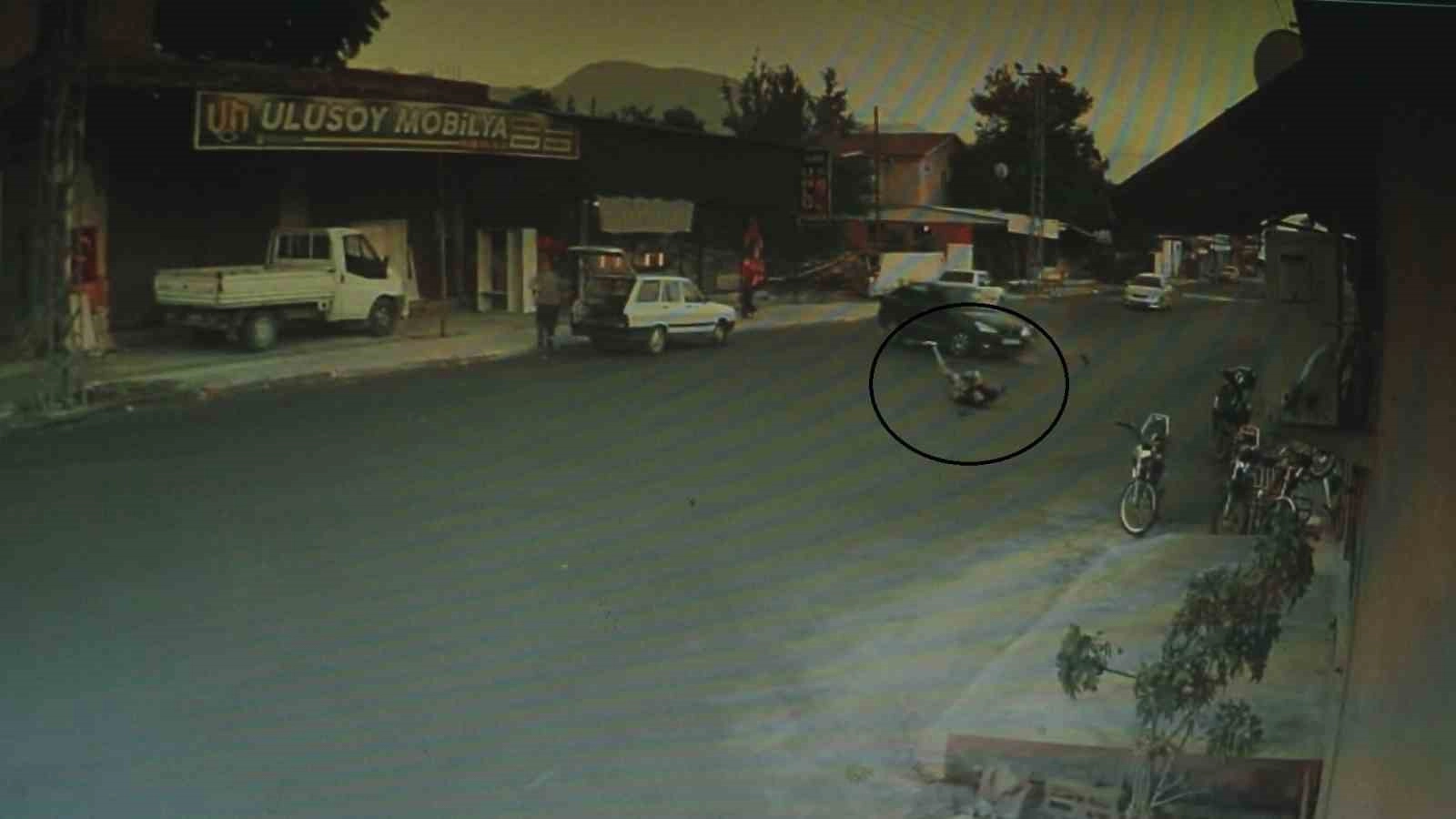 Hatay'da motosikletin, dönüş yapmak isteyen otomobile ok gibi saplandığı ve sürücünün metrelerce savrulduğu anlar güvenlik kamerasına yansıdı.