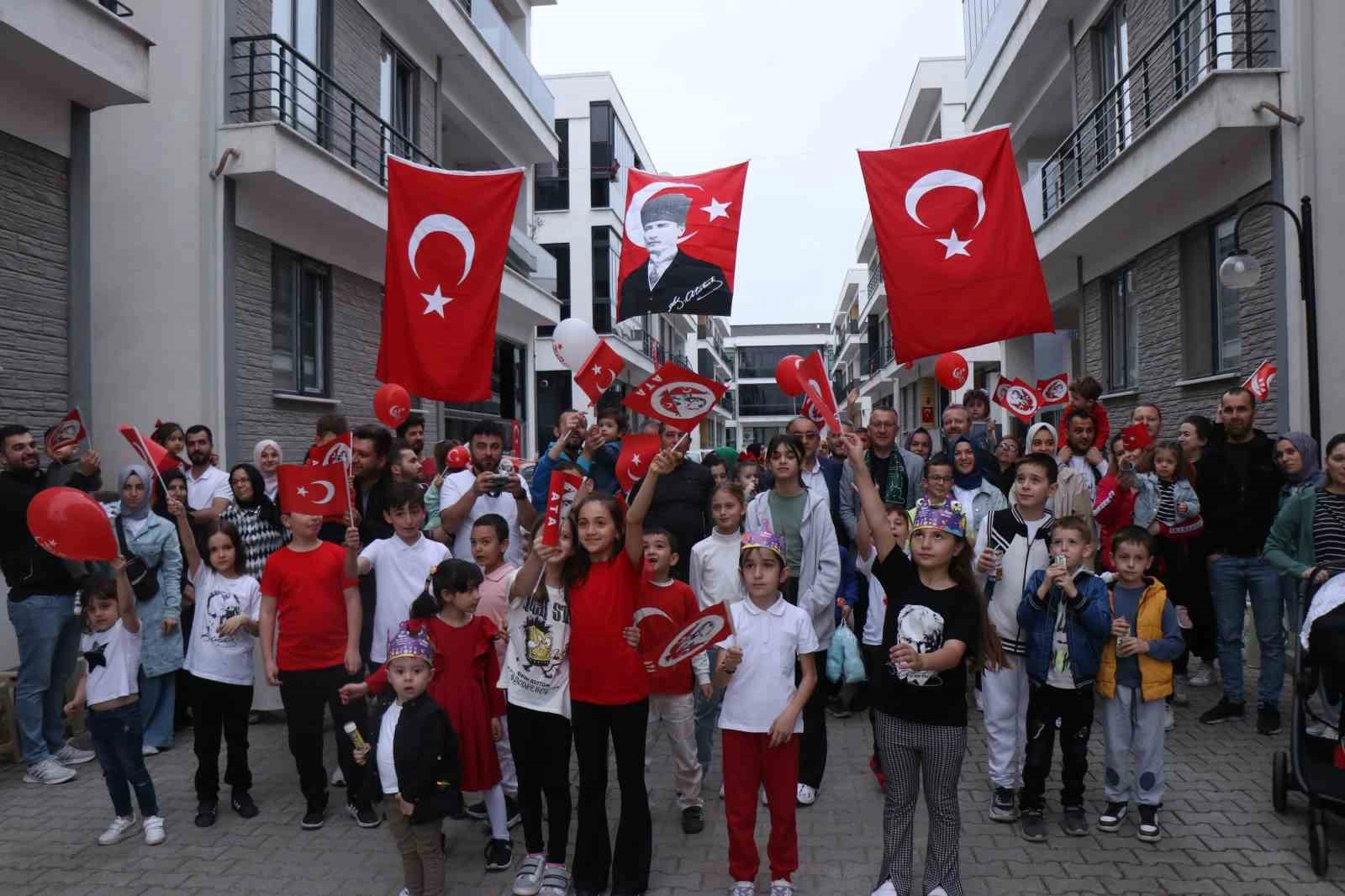 Pandeminin bile kutlamaya engel olmadığı günü gelenekselleştirdiklerini belirten Büşra Baycan, "Biz her sene çok büyük özenle bugünü programlıyoruz. Hatta bir hafta öncesinde bunun hazırlıklarına başlıyoruz. Bütün site sakinleri olarak mutlaka herkes bir şeyler yapıyor. Çocuklarımızın, bugünleri unutmaması için bir de bu evde kalmışlığın vermiş olduğu bir sıkıntıyı dışarı atmak için bir hafta boyunca bu sitede çalışmalar yapıyoruz. Camları süslüyoruz, balonlar şişiriyoruz. Hatta geçtiğimiz yıllarda resim yarışması yapmıştık, hala onları saklıyoruz. Onlar da büyüyorlar bununla. Değerlerimizi öğretiyoruz aslında çocuklarımıza. Pandemi sürecinde çocuklarımızın, okullarda bile iptal olan bir tören süreçleri vardı. Biz bugünü yaşatmak istedik, çünkü çocuklarımız bunu unutsun istemedik. Pandemi sürecini ne kadar süreceğini de bilmiyorduk sonuç olarak. Çocuklarımızın üzerinde evde kalmış olmanın verdiği sıkıntılar vardı dolayısıyla birlikte toplandık ve bu organizasyonu yapmaya karar verdik, sitemizi süsledik. İlk olarak resim çizmeyle başladık, sonrasında görkemli törenlere dönüştürdük. İlk başta mesafeli olarak kutladığımız süreç şimdi sarılma ve kucaklaşma ile devam ediyor, çok mutluyuz" dedi.