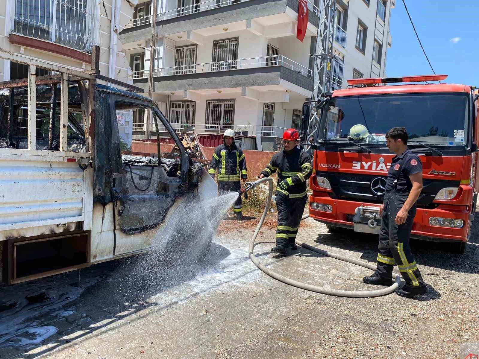 Hatay'da park halindeyken yanmaya başlayan kamyonette maddi hasar oluştu.
