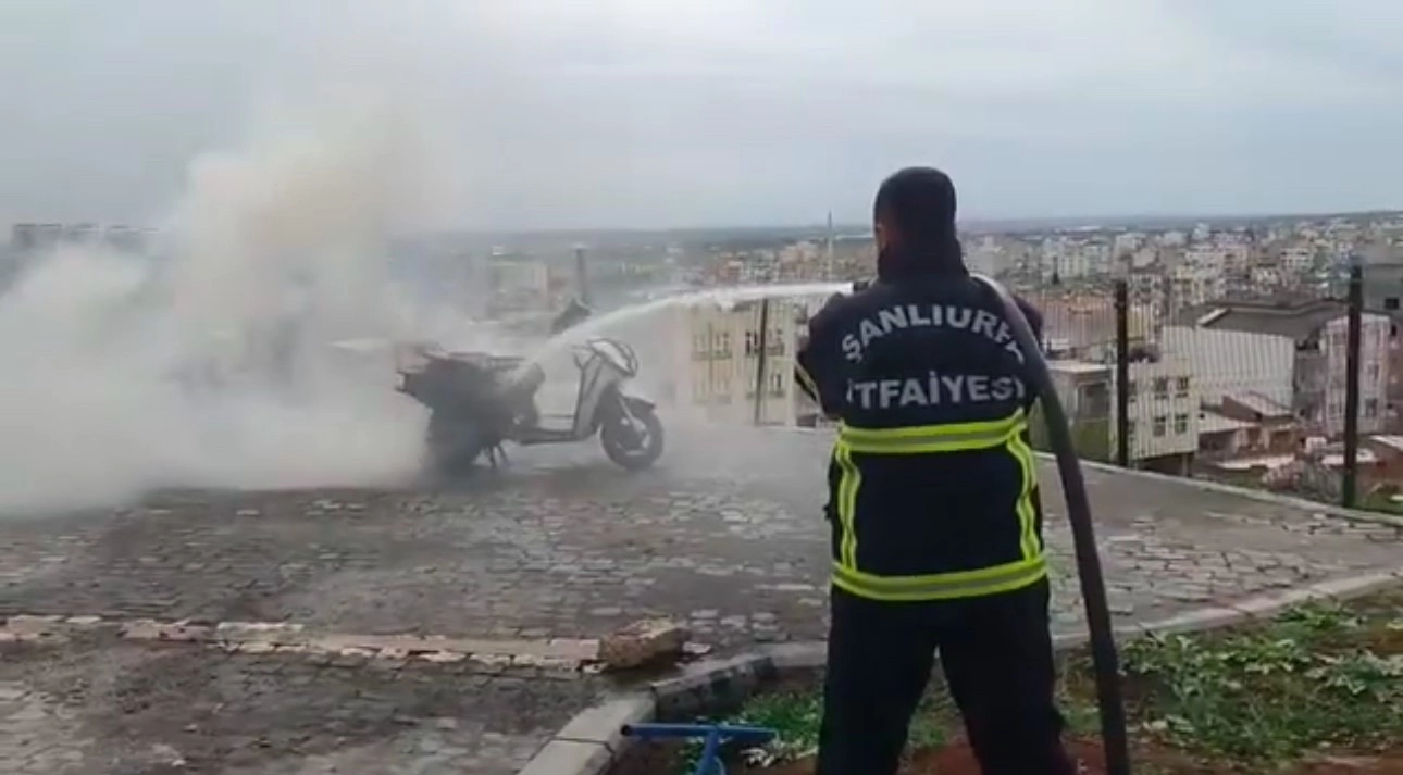 Şanlıurfa'da park halindeki bir motosiklet alev alev yandı.